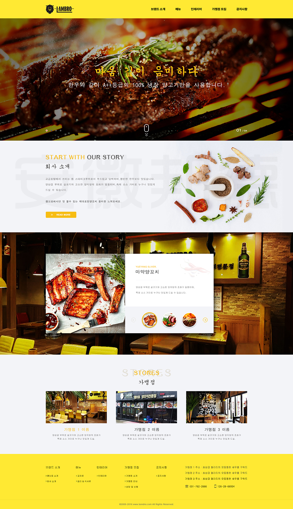 LAMBRO是韩国一家经营烤肉等韩国代表性食物的店铺。想创意团队为客户提供网站效果图设计, HTML5页面设计,程序开发和数据库开发,每位客户均按照需求提供定制设计开发,签订合同,分期付款,并提供完善的售后技术支持,第 一年免费送.com域名和10G(200M带宽)服务器空间。以下网站开发案例效果图我们为了防盗打了水印,网站开发案例均可提供网址和详细功能开发清单,详细内容可以咨询想创意团队客服人员微信!