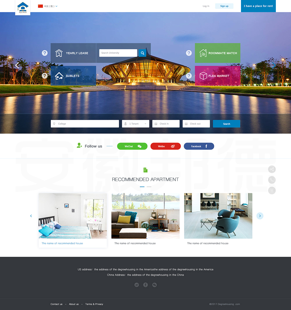 德霖易居是一家国外房屋租赁的网站,包括整租、转租、物品出售等。想创意团队为客户提供网站效果图设计, HTML5页面设计,程序开发和数据库开发,每位客户均按照需求提供定制设计开发,签订合同,分期付款,并提供完善的售后技术支持,第 一年免费送.com域名和10G(200M带宽)服务器空间。以下网站开发案例效果图我们为了防盗打了水印,网站开发案例均可提供网址和详细功能开发清单,详细内容可以咨询想创意团队客服人员微信!